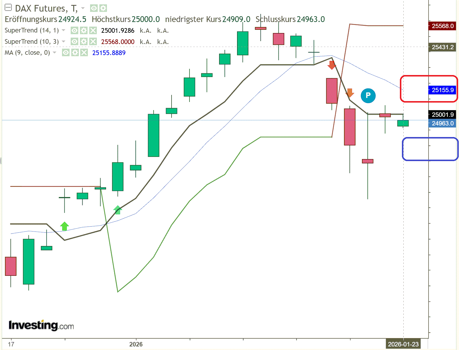 Bei den Konjunkturdaten stehen am heutigen Freitag der deutsche Einkaufsmanagerindex Verarbeitendes Gewerbe & Service im Fokus. Es wurde eine Stabilisierung auf niedrigem Niveau erwartet. Der deutsche Einkaufsmanagerindex Verarbeitendes Gewerbe kam mit 48,7 Punkten herein, erwartet wurden 47,8 Punkte, nach 47,0 Punkte zuvor. Der deutsche Einkaufsmanagerindex Dienstleistungen wurden mit 53,3 Punkten ausgewiesen, erwartet wurden 52,6 Punkte, nach 52,7 Punkte zuvor. Um 11:00 Uhr wird eine Rede von EZB-Präsidentin Christine Lagarde erwartet. Und übergeordnet läuft das World Economic Forum in Davos weiter. Am Nachmittag um 16:00 Uhr steht in den USA vor allem das Konsumklima der Uni Michigan für den Monat Januar im Fokus. Das Konsumklima gilt als Frühindikator für die Verbraucherausgaben. Statistisch gesehen neigen Midterm-Jahre dazu, ihre Januar-Gewinne in der letzten Woche teilweise wieder abzugeben. Und wenn der Donnerstag (wie gestern im S&P 500) stark war, neigt der Freitagvormittag oft zur Fortsetzung, bevor ab 16:00 Uhr (US-Handel) Gewinne mitgenommen werden ("Risk Off" ins Wochenende). Mit Blick auf das Januar-Barometer sind wir sind noch im Plus. Solange der DAX über 25.000 (bzw. dem 50-EMA) ins Wochenende geht, bleibt das Signal für 2026 „Grün". Bei den Einzelaktien stehen heute Webster Bank, Booz Allen Hamilton, SLB und Ericsson im Fokus.