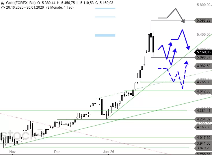 Mit dem Sprung über 4.990 USD setzte sich die Goldpreisrally zu Wochenbeginn zunächst noch dynamisch fort und sorgte für den Ausbruch über das Kursziel bei 5.400 USD. Im gestrigen frühen Handel setzte der Goldpreis die Kursexplosion fort und erreichte mit einem neuen Allzeithoch bei 5.598 USD fast das Projektionszielgebiet bei 5.630 USD. Dort setzte zur US-Eröffnung eine gewaltige 450-USD-Talfahrt ein. Nach einem Tief bei 5.098 USD gelang eine steile, aber zeitlich kurze Erholung, die jetzt in einen weiteren Kurseinbruch übergegangen ist. Damit droht ein Topbildungssignal.
