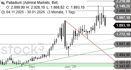 Palladium prallte gestern heftig von der Hürde bei 2.149 USD ab und muss jetzt versuchen, bei Kursen um 1.905 USD einen Boden zu bilden. Andernfalls droht die Fortsetzung der Verkaufswelle bis 1.772 USD.