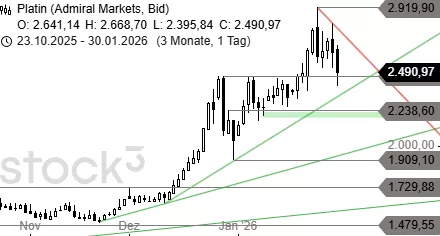 Die scharfe Korrektur bei Platin könnte bereits beendet sein. Ein Indiz dafür wäre jetzt ein Anstieg über die kurzfristige Abwärtstrendlinie auf Höhe von 2.700 USD. Ein weiterer Einbruch unter 2.400 USD würde dagegen für eine größere Verkaufswelle bis 2.238 USD und 2.170 USD sorgen.