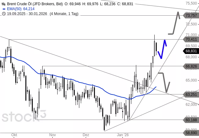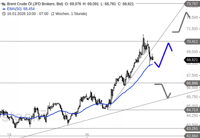 Nach der starken Aufwärtsbewegung der Vortage ist ein Pullback jederzeit möglich. Auf der Unterseite besteht Spielraum bis in den Bereich von 66,88 USD, ohne dass das bullische Chartbild dadurch gefährdet würde. Gelingt es Brent anschließend, sich wieder nach oben durchzusetzen und die 70-Dollar-Zone nachhaltig zu überwinden, könnte sich weiteres Aufwärtspotenzial in Richtung 73,76 USD eröffnen.