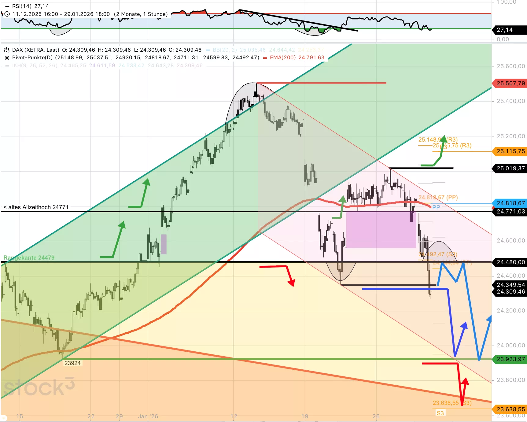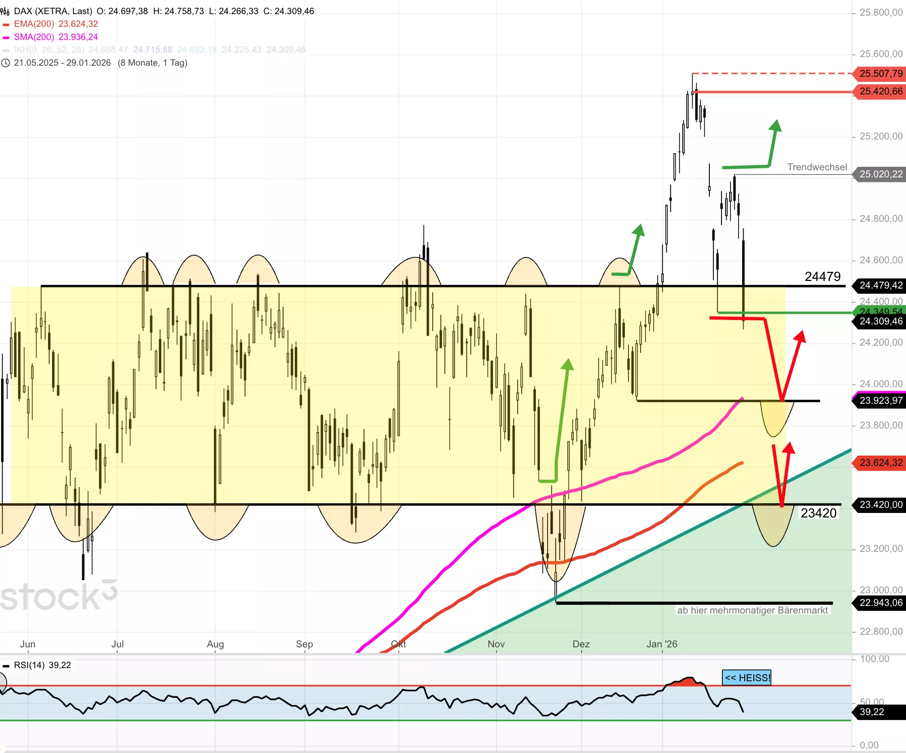 Der gestrige Handelstag hat beim DAX® nicht nur Spuren hinterlassen, sondern schmerzt tatsächlich sehr. Wenngleich die besondere Schwäche der SAP-Aktie einen Erklärungsansatz darstellt, wurde doch einiges an charttechnischem Porzellan zerschlagen. So fielen die deutschen Standardwerte mit dem Schließen der Kurslücke vom 22. Januar wieder unter die alten Ausbruchsmarken bei 24.700/24.600 Punkten zurück. Damit befindet sich das Aktienbarometer auch wieder in der zuvor ausgebildeten Schiebezone zwischen 24.700 und 23.000 Punkten. Mit Blick auf den nahenden Monatsultimo sollten Anlegerinnen und Anleger zudem beachten, dass der DAX® damit unter seinen Jahresschlusskurs von 2025 von 24.490 Punkten zurückgefallen ist. Sollte das heute so bleiben, sendet das „Januar-Barometer“ ein negatives Signal. Die nächste wichtige Rückzugslinie wird durch den Durchschnitt der letzten 200 Tage (akt. bei 23.936 Punkten) definiert. Um den aktuellen Schuss vor den Bug zu negieren, müsste der DAX® indes die ehemalige Ausbruchszone bei 24.600/24.700 Punkten schnellstmöglich zurückerobern.