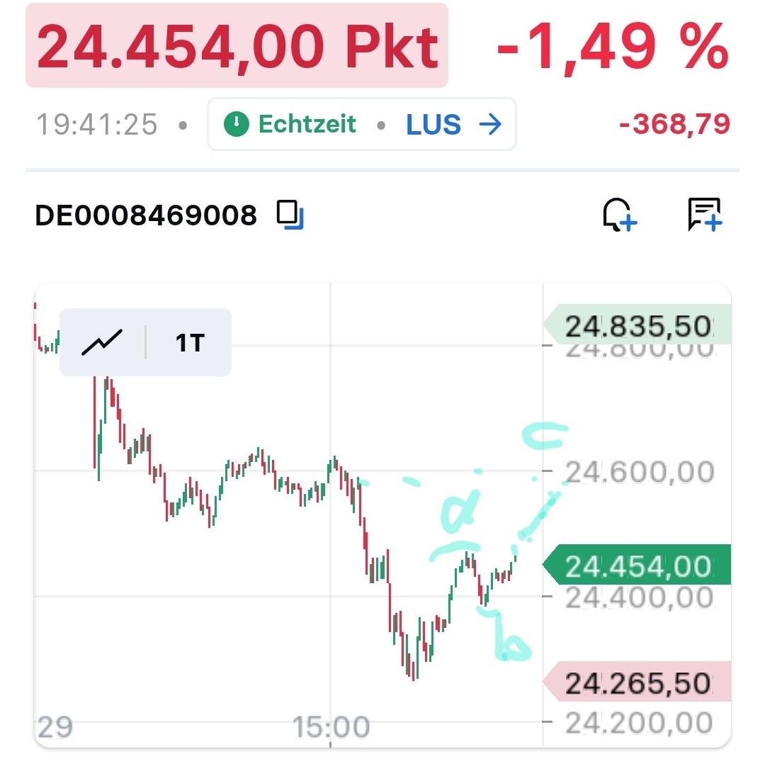 Der DAX hat heute früh sogleich eine Entscheidung! A) etabliert er sich unter 24.350 und fällt sofort zu 23.935/23.925 B) oder es gibt erst noch ein Aufbäumen in Form des Behauptens der Vorwochentiefs bei 24.350 und der Ausbildung eines Rebounds zu 24.475/24.818, um dann wieder zu fallen. Viel seltener schiebt die Käuferriege den DAX heute auch über 24.818 hinaus, um zu 24.770 vorzustoßen. Unter 23.925 fiele der DAX heute zum Max-Punkt des Tages im Bereich 23.638/23.625 (S3 und EMA200/Tag).Eine klare bullische Lage im Chart gäbe es nun erst wieder über 25020. Das wird schwer.