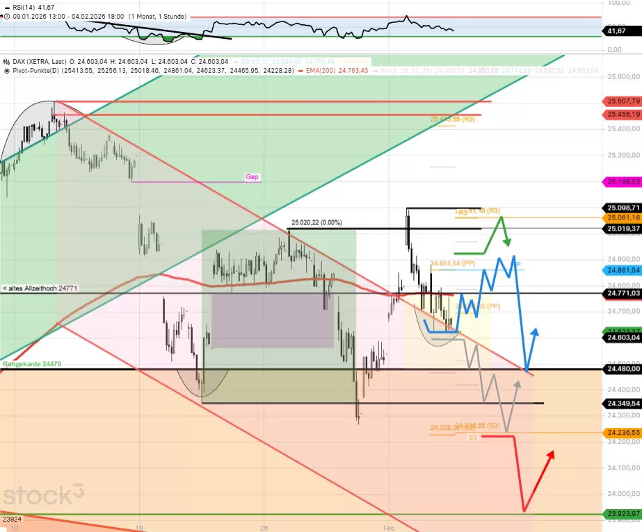 Der DAX zieht wahrscheinlich bis 9 Uhr/9:30 Uhr direkt aufwärts zu 24.693/24.700/24.738. Da 24.693/24.700/24.738 ein großes Widerstandscluster ist (für Intraday-Maßstäbe), ist es plausibel, dass der DAX ab 24.693/24.700/24.738 die Richtung wechselt und bis 24.585 fällt. Oberhalb von 24.770 lassen sich Szenarien für einen DAX-Tagesanstieg zu ca. 24.900 ableiten. Unterhalb von 24.585 fällt der DAX wahrscheinlich zu 24.480 und darunter wiederum zu 24.350, 24.267 sowie maximal heute zu 24.236.