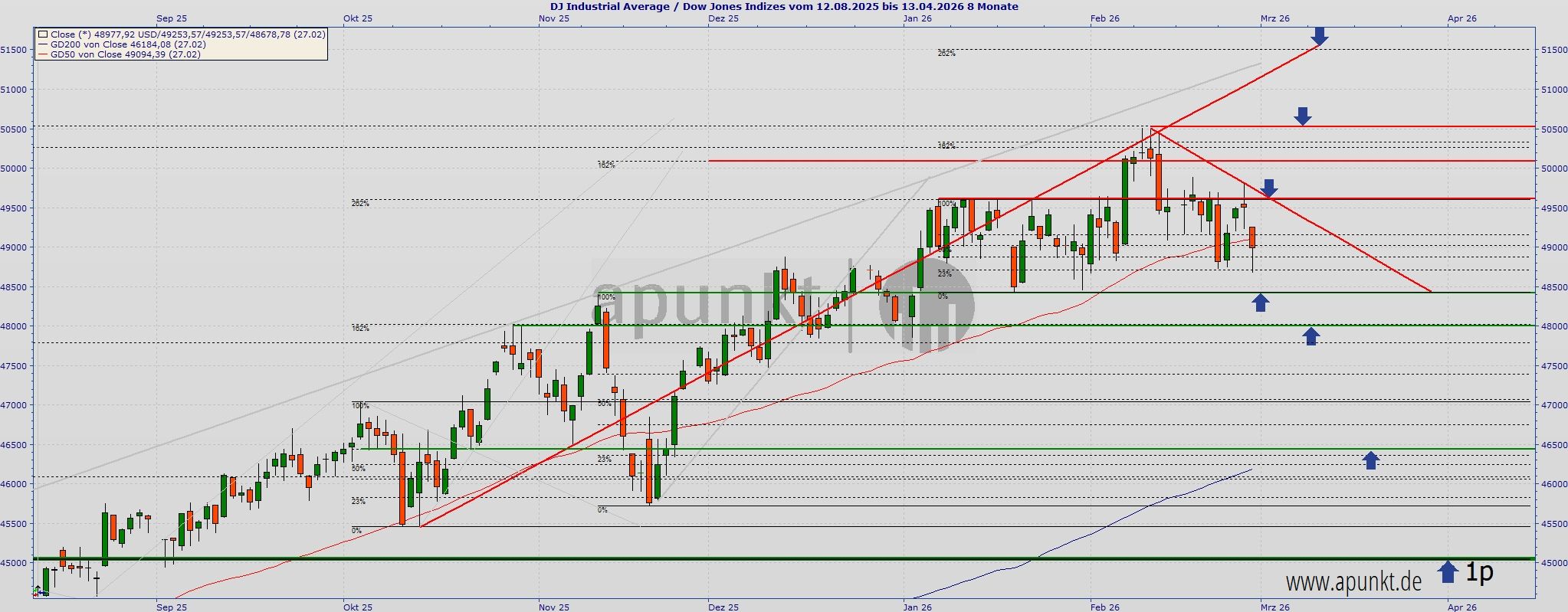 Ein Ende der Konsolidierung setzt einen Tagesschluss über der nun bestehenden Abwärtstrendlinie (seit dem Allzeithoch Februar) voraus. Diese verläuft am Freitag bei ca. 49.450 Punkten.