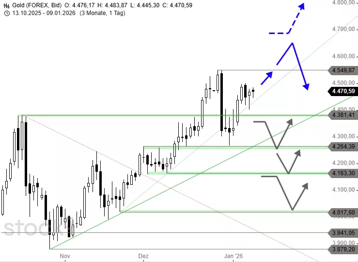 Seit Ende Oktober läuft beim Goldpreis ein weiterer übergeordneter Rallyabschnitt, der zuletzt zum Ausbruch über das bisherige Rekordhoch bei 4.381 USD führte. Nachdem das erste Kursziel dieser Kaufwelle bei 4.460 USD überrannt worden war, stieg der Kurs des Edelmetalls bis zur Projektionsmarke bei 4.540 USD. Ausgehend vom neuen Allzeithoch bei 4.549 USD sorgte ein heftiger Abverkauf für eine kurze Schrecksekunde. Dieser Einbruch wurde allerdings schon am Support bei 4.264 USD gestoppt und damit Ende Dezember der nächste Angriff auf das Rekordhoch gestartet.