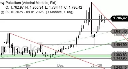 Mit einem Ausbruch über die zentrale kurzfristige Abwärtstrendlinie und das Hoch bei 1.844 USD könnte Palladium den Aufwärtstrend der letzten Wochen reaktivieren und sogar bis 1.957 USD steigen. Unter 1.695 USD wäre diese Chance zunächst vergeben.