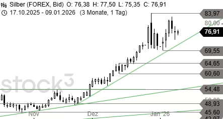 Silber könnte jetzt mit einem Anstieg über 79,00 USD die Hürde bei 80,50 USD und das Rallyhoch bei 83,97 USD attackieren. Kurse unter 74,56 USD würden dagegen für eine Korrektur bis 69,55 USD sorgen.
