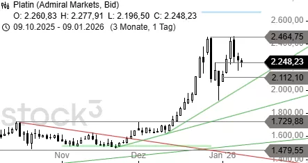 Nach dem Scheitern am neuen Allzeithoch bei 2.464 USD könnte Platin ausgehend vom Supportbereich bei 2.200 USD einen weiteren Angriff auf das Hoch starten. Darüber wäre eine Kaufwelle bis 2.680 USD möglich. Kurse unter 2.112 USD sprächen dagegen für eine ausgedehnte Korrektur.