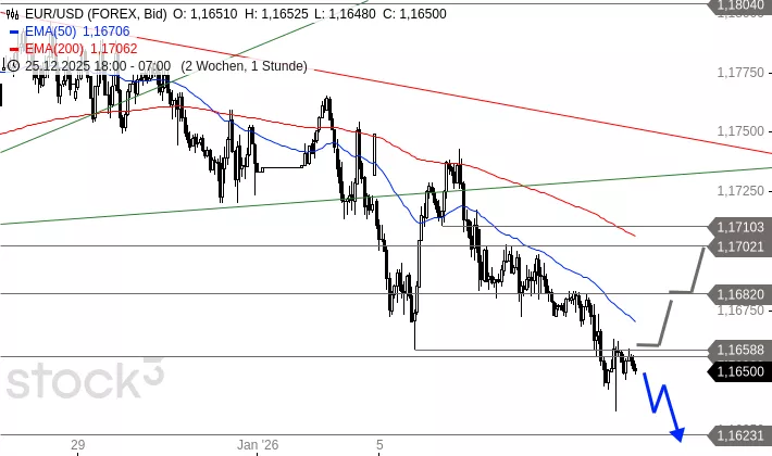 Die Abwärtsbewegung der letzten Wochen ist intakt. Es steht noch ein Ziel bei 1,1597 USD aus. Gelingt ein Ausbruch über 1,1659 USD könnte eine Erholung in Richtung 1,1682 oder sogar 1,1702 USD eingeschoben werden.