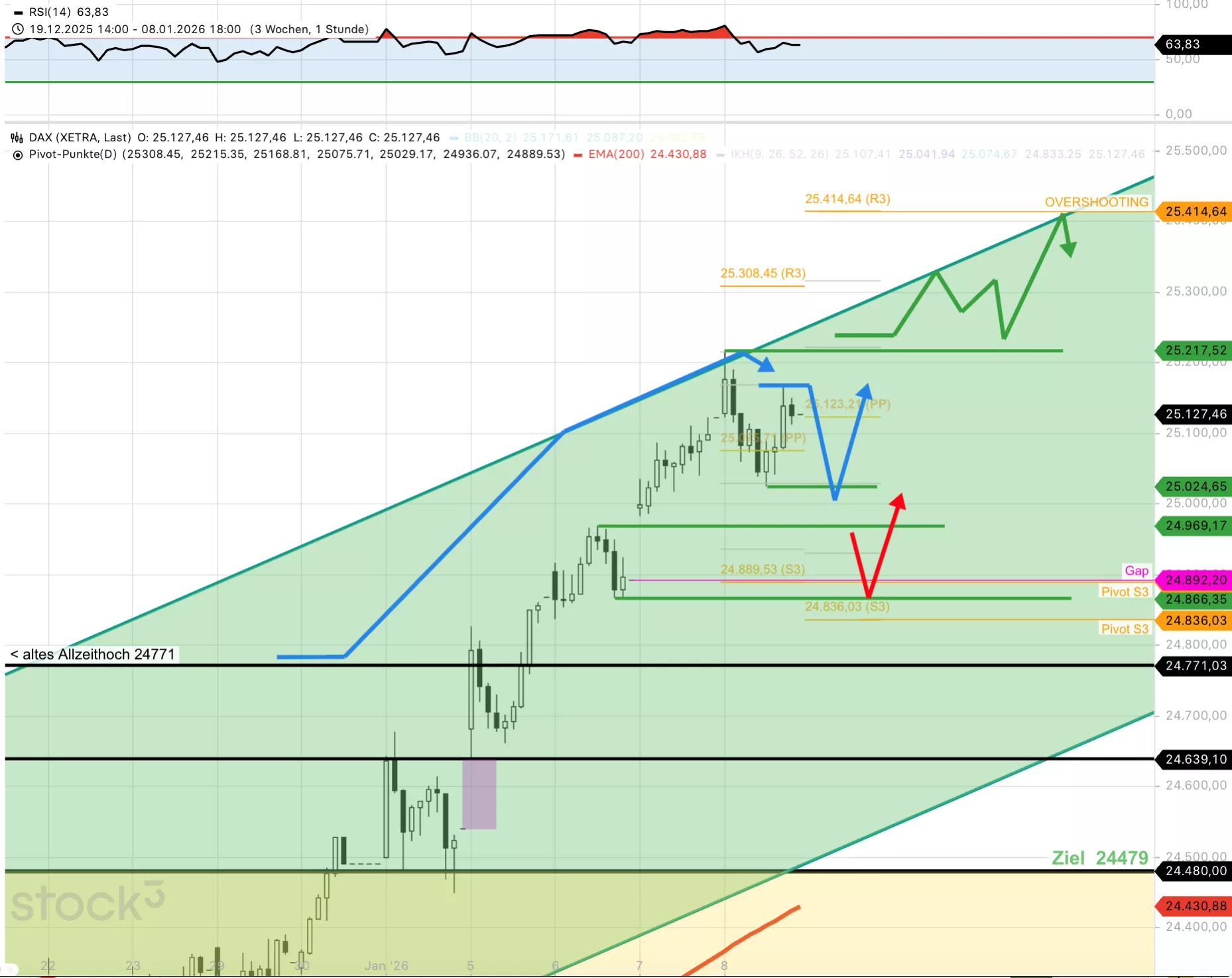DAX-Dochtkerze auf Tagesebene am Wochen-Pivot R3 25.149. Das spiegelt etwas aufkommende Unsicherheit bzw. die baldige Einleitung eines Pullbacks wider. Der Stundenchart-Trendkanal wurde in der gestrigen ersten Handelsstunde auch ausgereizt (25.200).