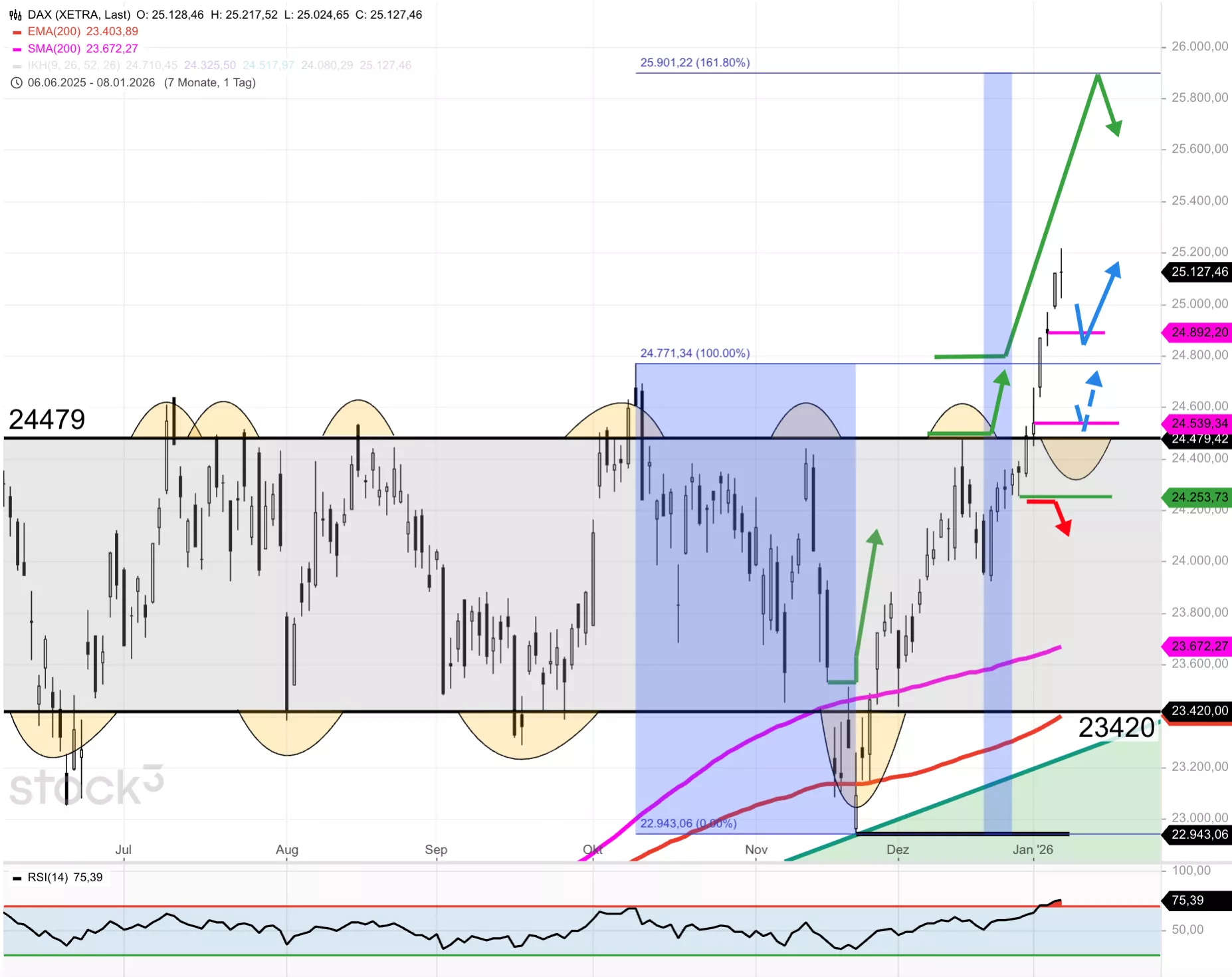 Der Dow Jones ist damit ebenfalls in einer bedeutsamen Phase. Kurzfristig befinden sich wichtige Unterstützungen beim alten Allzeithoch bei 48.886 Punkten sowie am gebrochenen Abwärtstrend ab 12. Dezember, aktuell bei 48.688 Punkten. Solange diese Marken Bestand haben, bleibt das kurzfristige Chartbild bullisch. Ein Rückfall unter diese Marken könnte jedoch eine ausgeprägte Konsolidierungsbewegung in Gang setzen. Erster Anlaufpunkt wäre der EMA50 auf Tagesbasis bei 47.745 Punkten, und das Gap vom 26. November zwischen 47.196 und 47.182 Punkten.
