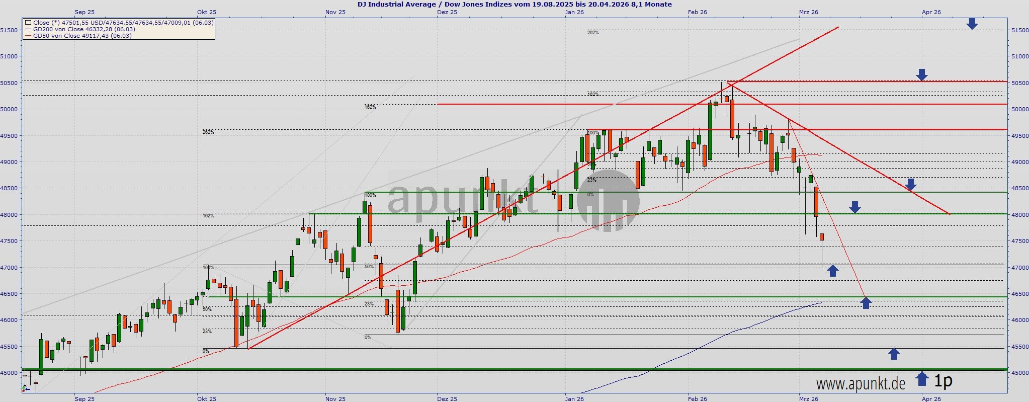Nach oben gibt es ein erstes positives Signal, wenn die kurzfristige steile Abwärtstrendlinie gebrochen werden kann. Diese verläuft am kommenden Freitag bei ca. 47.200.