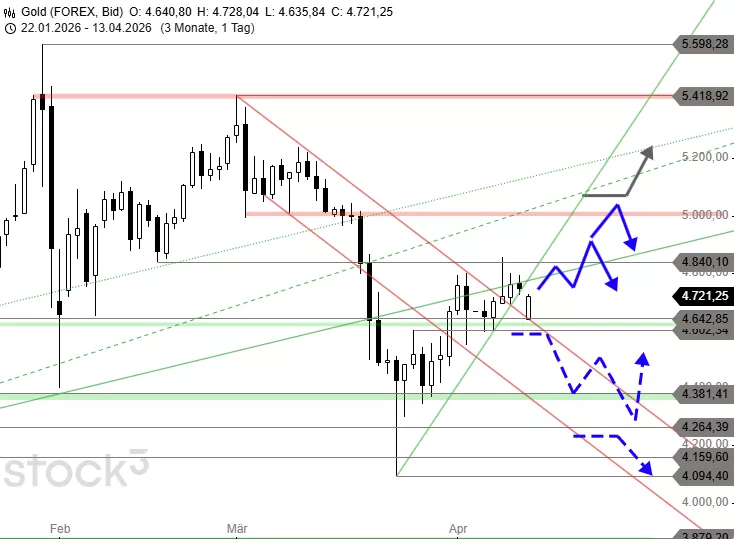 Die Kurserholung seit dem Tief der zweiten großen Verkaufswelle bei 4.094 USD von Ende März dauert an, ist allerdings nach dem Erreichen der zentralen Zielmarke bei 4.840 USD in eine fragile und schwankungsreiche Seitwärtsphase übergegangen. In der letzten Woche erfolgte der erwartete Anstieg an diesen Widerstand, an dem der Kurs allerdings nach unten abprallte und erneut an den Support bei 4.706 USD fiel. Heute brach der Goldpreis unter die zentrale Aufwärtstrendlinie und an die Haltemarke bei 4.642 USD ein, ehe dort eine Erholung einsetzte.
