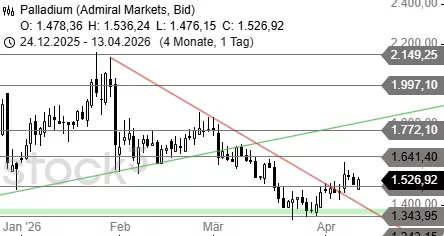 Palladium könnte jetzt ausgehend von Kursen um 1.474 USD die kleine Korrektur beenden und eine zweite Kaufwelle bis 1.641 USD starten. Über der starken Barriere wäre sogar ein Anstieg bis 1.772 USD möglich.