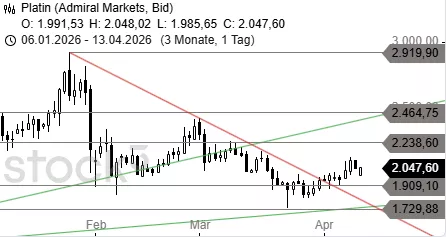 Die Käufer haben die Ausbruchschance über 2.075 USD bei Platin noch nicht abgehakt. Über der Hürde könnten sie den Kurs direkt weiter bis 2.238 USD antreiben. Erst ein Rückfall unter den Support bei 1.909 USD wäre jetzt problematisch.