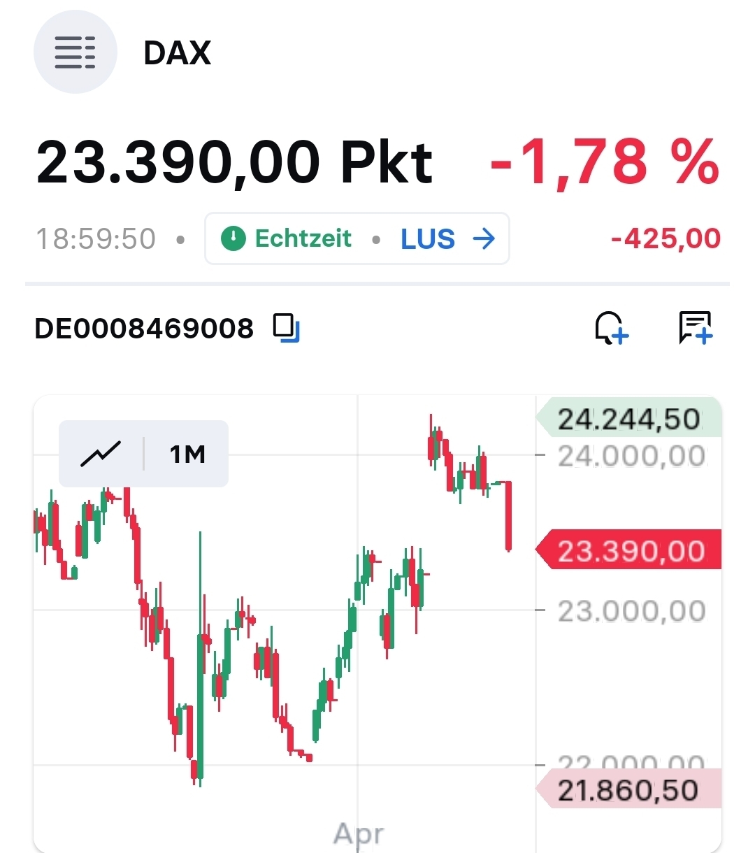 1) Ich rechne seit 3 Handelstagen jederzeit mit DAX-Pullbacks bis 23.400 (Gap). Heute wird es so weit sein, denn die Vorbörse sah man heute Nacht schon bei 23.424 takten. 2) Der DAX war seit 9.4. auf dem "FADING THE GAP"-Pfad. Ein DAX bei 23.400 wäre also heute keine Überraschung. Anschließend soll es Chancen geben, dass der DAX erneut Richtung 24.100/24.200 (ggf. zu 24.325) zieht. 3) BÄRISCH: Ein Handel unter 22.840 wäre bärisch und würde zeitnahe Anstiegschancen zu den Vorwochenhochs negieren. Noch bärischer wird es per Tageskerzenchart-Logik unter 22.209. 4) BULLISCH: Ein Tagesschluss über 24.325 macht den Weg frei zu 25.500 (Allzeithoch).