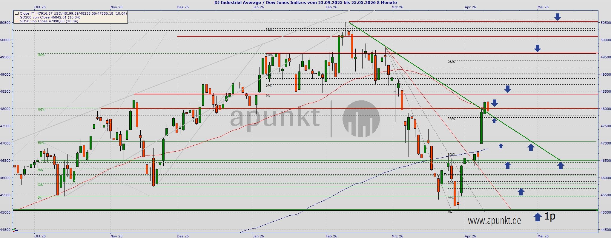 Kommt doch positive Bewegung in die Gespräche, insbesondere was die Straße von Hormus betrifft, könnte der Dow erneut die 48.000 testen. Richtig frei nach oben wird der Weg aber erst nach Tageschluss über ca. 48.450 Punkten.