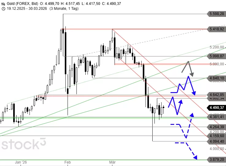 Anfang März brach sich der zweite Abwärtsimpuls der großen Korrektur beim Goldpreis Bahn und ließ den Kurs vom Widerstand bei 5.420 USD bis 4.094 USD einbrechen. Seither läuft eine Erholung, die Gold direkt über das zuvor gebrochene, ehemalige Rekordhoch bei 4.381 USD führte. Der Versuch, sich gegen die Verkaufssignale des massiven Kurssturzes zu stellen, trieb den Goldpreis fast schon an den Widerstand bei 4.642 USD, ehe in der letzten Woche eine leichte Korrektur einsetzte. Sie konnte allerdings schon auf Höhe von 4.381 USD unterbunden und der nächste Anstieg gestartet werden.