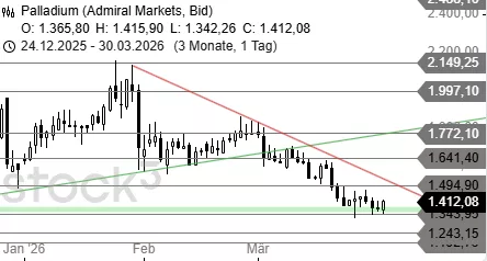 Palladium steigt von der Unterstützung bei 1.343 USD in Richtung der Hürde bei 1.494 USD an. Solange das Metall auch weiterhin im Bereich von 1.343 USD gekauft wird, ist eine Erholung bis zur 1.494-USD-Marke zu favorisieren und ein Sturz auf 1.243 USD weniger wahrscheinlich.
