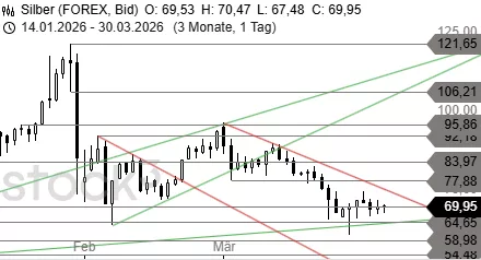 Silber attackiert die 70,00-USD-Marke, deren Bruch eine Erholung bis 74,53 USD auslösen kann. Sollte die Käuferseite dagegen jetzt an der Hürde scheitern, stünde eine kleine Korrektur bis 68,00 USD an.