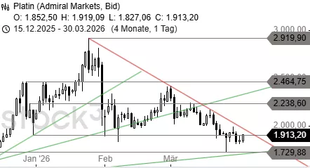 Aktuell versuchen die Bullen, Platin weiter über 1.909 USD anzutreiben und damit eine Erholung in Richtung 2.015 USD zu starten. Über der Marke wäre sogar ein Anstieg bis 2.238 USD möglich. Unter 1.834 USD stünde dagegen eine Korrektur bis 1.729 USD an.