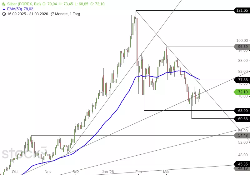 In einer zweiten Korrekturwelle rutschte Silber an den Vortagen bis zur Marke von 60,68 USD zurück. Dort stabilisierte sich die Notierung und konnte sich im Bereich um 70,00 USD fangen. In der Folge setzte eine Erholung ein, die den Kurs wieder näher an den mittelfristigen Abwärtstrend heranführte.