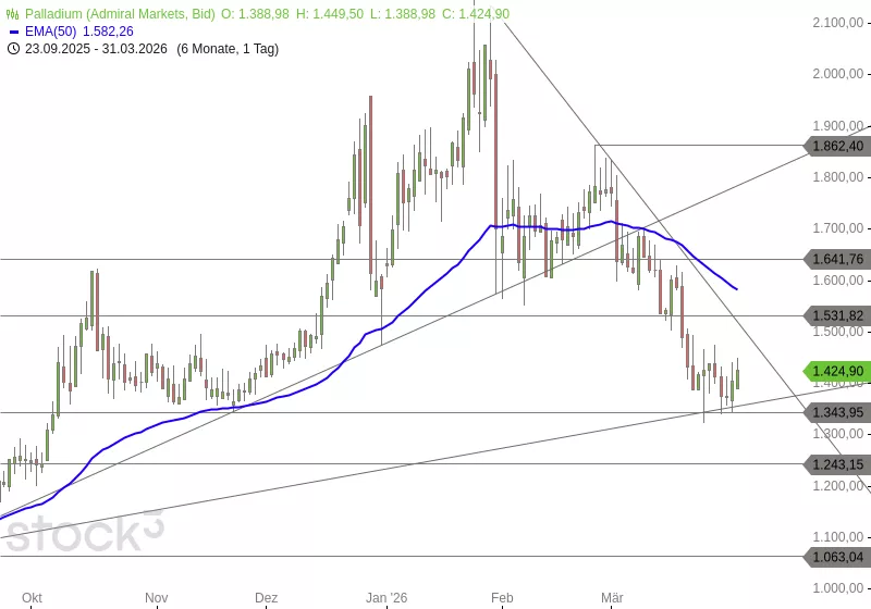 Die zweite Korrekturwelle führte Palladium in den vergangenen Wochen klar unter die Marke von 1.532 USD. Im Bereich der Unterstützung bei 1.345 USD konnte sich der Kurs stabilisieren, wobei auch der mittelfristige Aufwärtstrend stützend wirkt. Daraus ergibt sich die Chance auf eine Erholung in Richtung des mittelfristigen Abwärtstrends bei etwa 1.500 USD. Erst oberhalb dieser Marke würden sich erste Kaufsignale ergeben. Unterhalb von 1.332 USD würde sich das Chartbild hingegen weiter eintrüben.