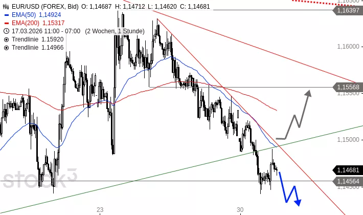 EUR/USD fiel am 13. März 2026 auf ein Tief bei 1,1411 USD. Danach erholte sich das Währungspaar auf 1,1640 USD. Am 25. März näherte sich EUR/USD diesem Hoch noch einmal an und drehte danach nach unten ab. Gestern durchbrach EUR/USD den Aufwärtstrend seit 13. März. Heute Nacht kehrte das Währungspaar an diesen Trend zurück, prallte aber daran nach unten ab.