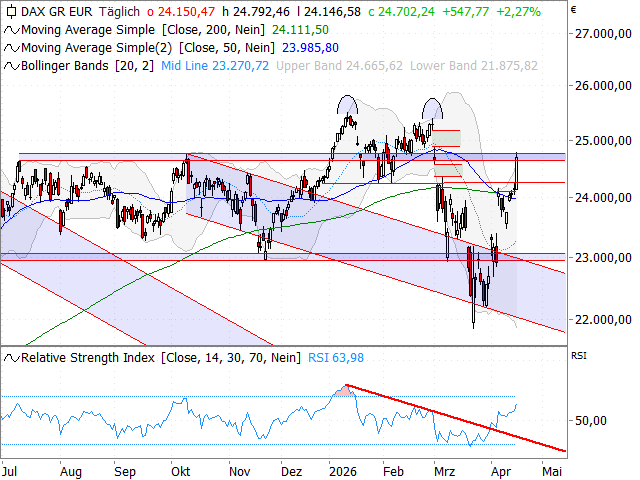 Beim DAX® steht inzwischen die vierte weiße Wochenkerze in Folge zu Buche. Vom Tief bei 21.864 Punkten konnten sich die deutschen Standardwerte dabei um fast 3.000 Punkte erholen. Technisch wurde im Verlauf der Erleichterungsrally z. B. die 200-Tage-Linie (akt. bei 24.112 Punkten) und der Jahresschlusskurs von 2025 (24.490 Punkte) zurückerobert sowie das Gap von Anfang März geschlossen. Die nächsten wichtigen Barrieren hat der DAX® jetzt unmittelbar vor der Brust. Gemeint sind die Hochpunkte vom Juli und Oktober 2025 bei 24.639/24.771 Punkten. Die große Abwärtskurslücke vom 2. März bei 24.898/25.188 Punkten stellt danach eine weitere Widerstandszone dar. In den Handel dürften die deutschen „blue chips“ heute aber deutlich schwächer starten. Deshalb noch der Blick auf die Unterseite. Hier definieren die bereits angeführte 200-Tage-Linie und das kürzerfristige Pendant der letzten 50 Tage (akt. bei 23.986 Punkten) erste Rückzugsmarken. Darüber hinaus stellt die Aufwärtskurslücke vom 14. April (23.938 zu 23.757 Punkten) eine weitere markante Haltezone dar."