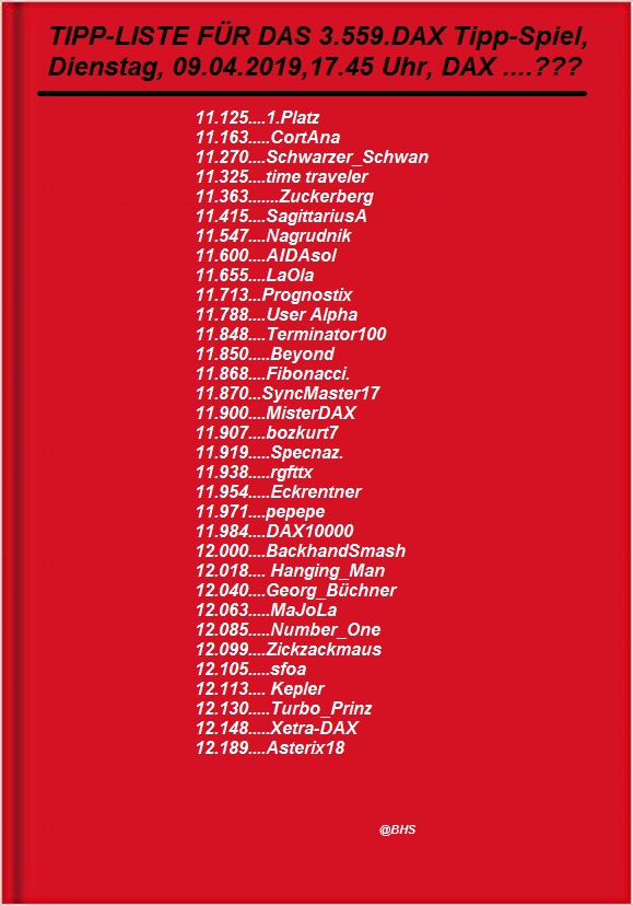 3.559.DAX Tipp-Spiel, Dienstag, 09.04.2019,17.45 Uhr, DAX ....???