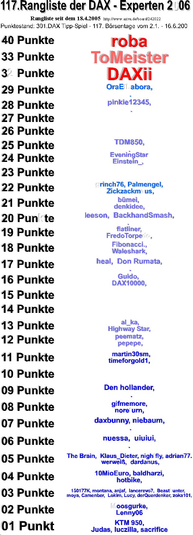 302.DAX Tipp-Spiel, Montag, 19.06.06 2622047    cassius.c   17. Tipp 5.400 pinkie12345 18.06.06 17:45 16.06.06 00:21