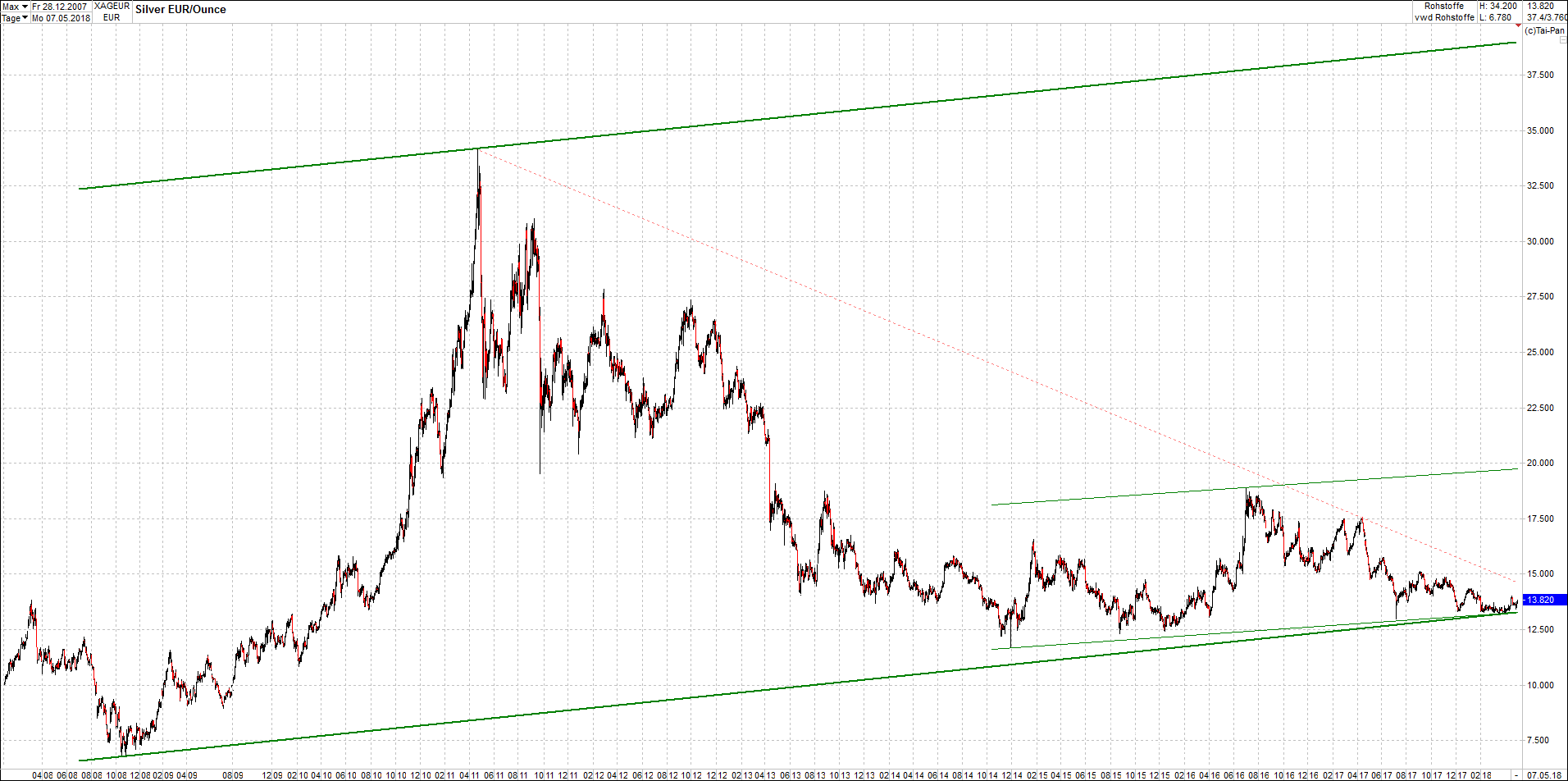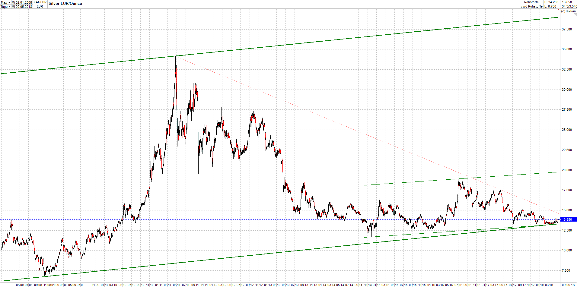 Mehr über die 4 und auch weitere 3 wikifolio-Endlos-Zertifikate gibt es hier. Aber bitte da nicht erschrecken wegen den charts, weil die wikifolios sollten die original-performance so getreu nachbilden wie möglich, aber die charts bei wikifolio zeigen leider nur ein kleines Zeitfenster. Deswegen habe ich hier die entsprechenden langfristigen original-performance-charts reingestellt. Die kann ich auch gerne ab und zu aktualisieren. Die Trendkanäle bzw. andere Linien, oder Grafiken in diesem thread sind aber keine Empfehlungen, oder Beratung, sondern sie zeigen ausschließlich meine eigene Meinung.