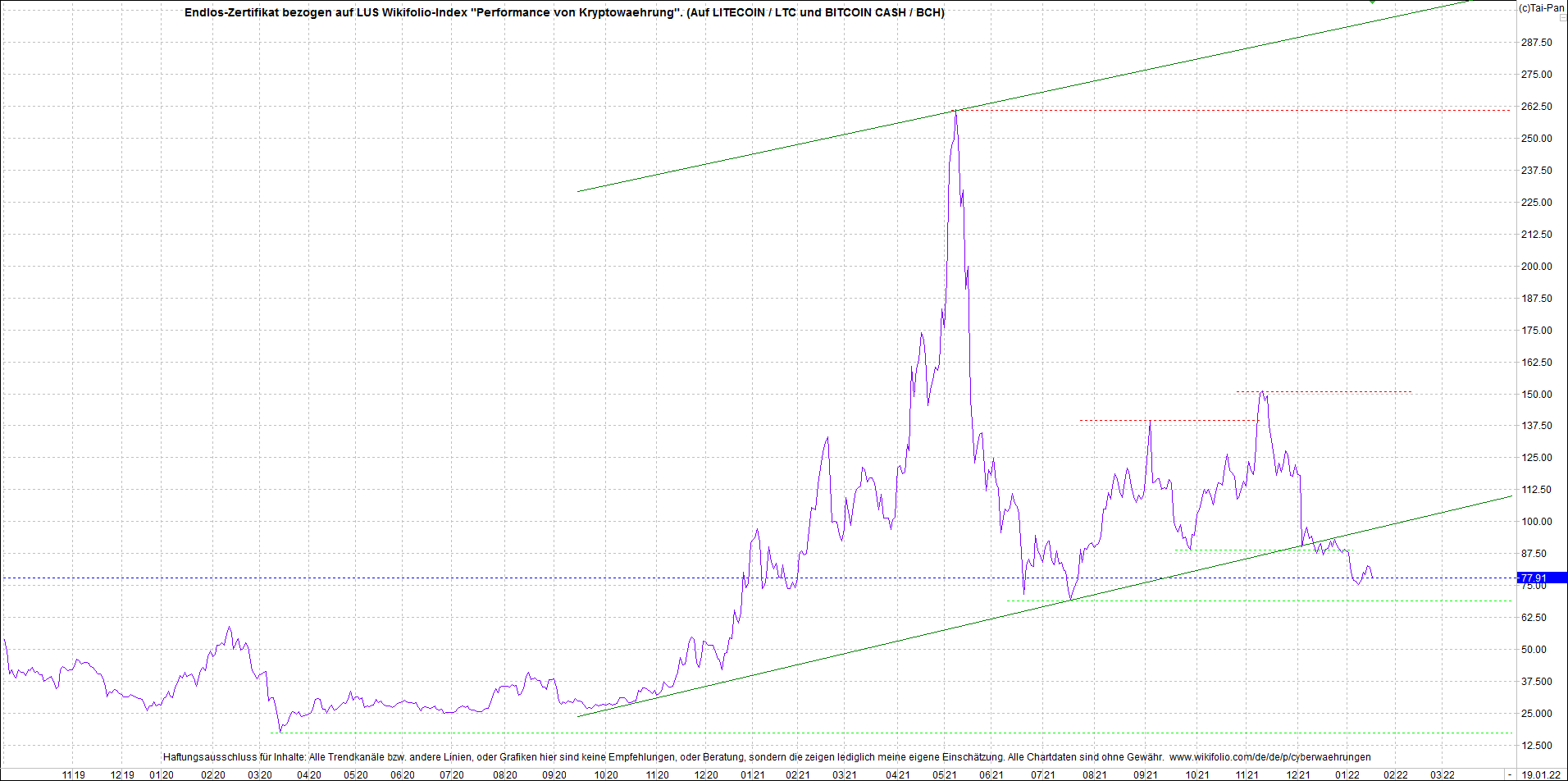 Anbei das Zertifikat, bekannt als: Endlos-Zertifikat bezogen auf LUS Wikifolio-Index "Performance von Kryptowaehrung",  jetzt versorgt mit Performance von Litecoin (LTC) und von Bitcoin Cash (BCH).