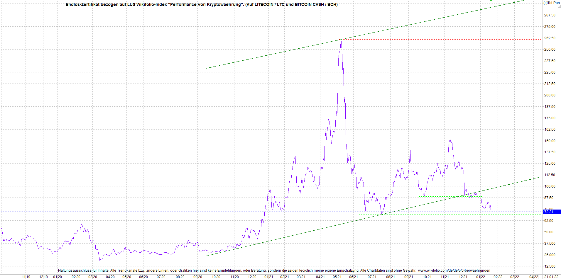 Anbei das Zertifikat, bekannt als: Endlos-Zertifikat bezogen auf LUS Wikifolio-Index "Performance von Kryptowaehrung",  jetzt versorgt mit Performance von Litecoin (LTC) und von Bitcoin Cash (BCH).
