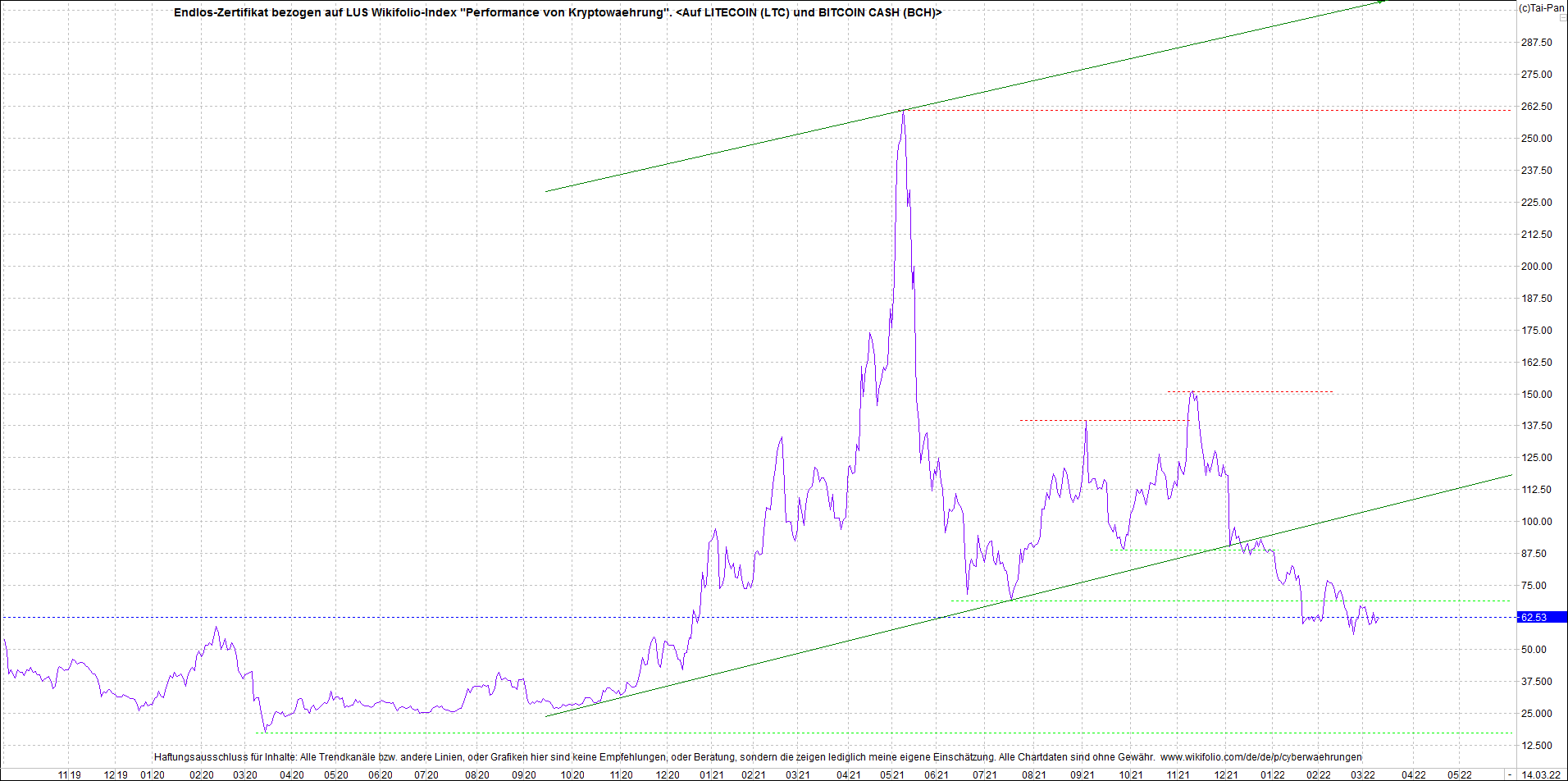 Anbei das Zertifikat, bekannt als: Endlos-Zertifikat bezogen auf LUS Wikifolio-Index "Performance von Kryptowaehrung",  jetzt versorgt mit Performance von Litecoin (LTC) und von Bitcoin Cash (BCH).