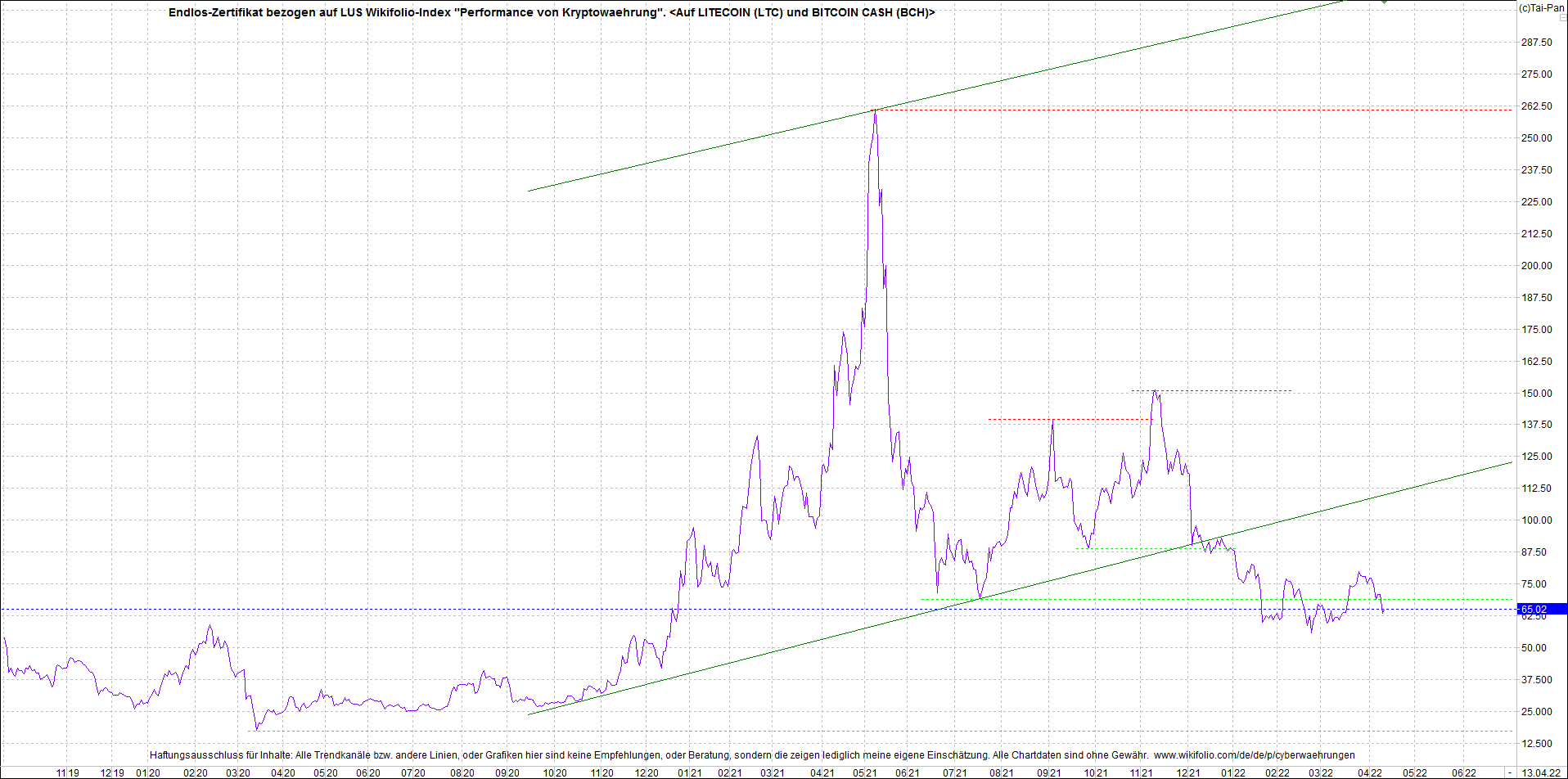 Anbei das Zertifikat, bekannt als: Endlos-Zertifikat bezogen auf LUS Wikifolio-Index "Performance von Kryptowaehrung",  jetzt versorgt mit Performance von Litecoin (LTC) und von Bitcoin Cash (BCH).