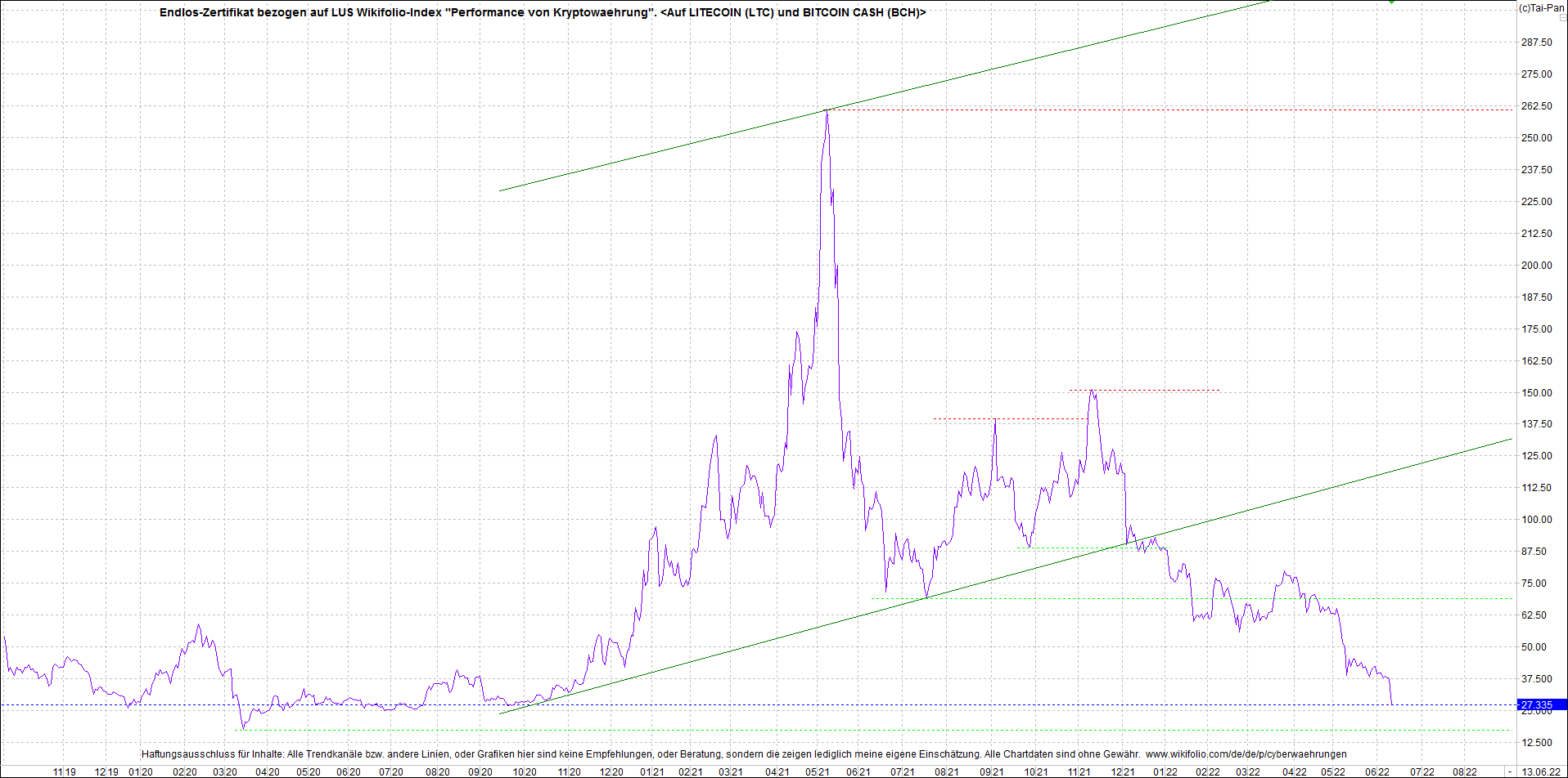 Anbei das Zertifikat, bekannt als: Endlos-Zertifikat bezogen auf LUS Wikifolio-Index "Performance von Kryptowaehrung", jetzt versorgt mit Performance von Litecoin (LTC) und von Bitcoin Cash (BCH).
