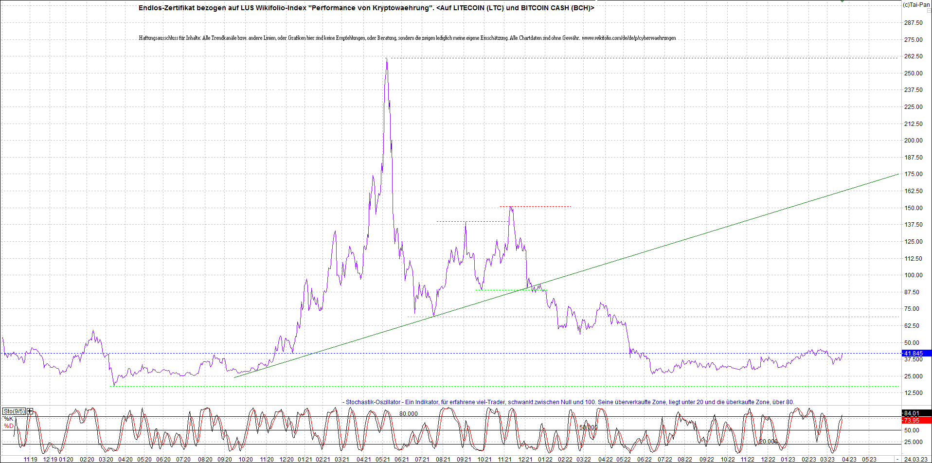 Anbei das Zertifikat, bekannt als: Endlos-Zertifikat bezogen auf LUS Wikifolio-Index "Performance von Kryptowaehrung",  jetzt versorgt mit Performance von Litecoin (LTC) und von Bitcoin Cash (BCH).