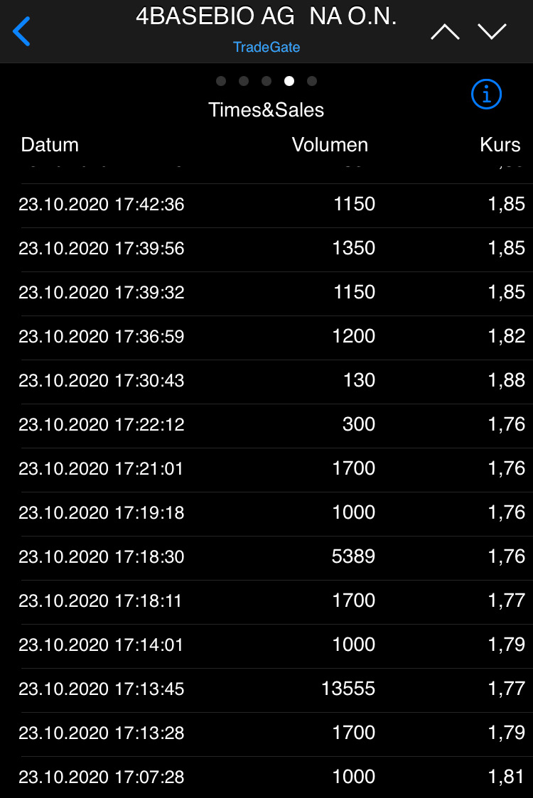 Hier wurde mit kleinem Volumen etwas am Baum geschüttelt...mit ebenso kleinem Volumen ging es dann auch wieder hoch. Dieses "Attacke-Muster" habe ich in den letzten 6 Monaten schon drei-/viermal zufällig live miterlebt, manchmal kam danach die "Zours-Kauf-Meldung", manchmal eben auch nicht. Ich bin dennoch felsenfest davon überzeugt hierin ein Einkaufsmuster zu erkennen, aber mit Gewissheit kann das wohl niemand sagen. Vielleicht ist es auch völliger Blödsinn.