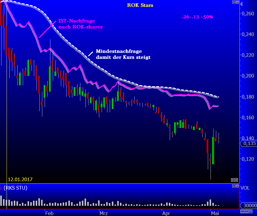 Fazit: alles Volumen unter der Schwelle ist keine echte Nachfrage nach ROK-shares, der Kurs wird durch dieses Volumen nicht angekurbelt (Verräter schläft nie), vermutlich ist es angebotslastiges Volumen (Geld gegen shares, Geld aus dem Wert heraus). Der Kurs steigt nur wenn Nachfrage nach shares ihn antreibt (shares gegen Geld, Geldfluss in den Wert hinein).
