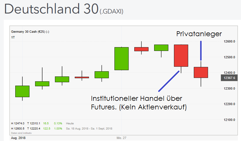 Der Hintergrund ist, dass die Institutionelle "Anleger" in ruhigeren Phasen in den Markt eingreifen und die Indizes kurzfristig hin und her schieben, um die Privatanleger in Bewegung zu setzen bzw. zum Handeln zu bewegen. Dabei wird weder Charttechnik beachtet noch fundamentale Lage, da allein die Umsätze an den Märkten wichtig sind. Die Bewegungen sind somit unberechenbar. Irgendeine Analyse oder Charttechnik wird dennoch zutreffend sein, wäre jedoch eher Zufall als Strategie, da die Wahrscheinlichkeiten für steigende oder fallende Kurse fast immer bei 50:50 (50%) liegt.