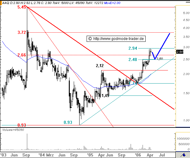 Charttechnischer Ausblick: Die AAP IMPLANTATE Aktie befindet sich in Mitten der avisierten Aufwärtsbewegung bis 3,72 Euro. Ein evtl. Rücksetzer sollte maximal bis 2,48-2,50 Euro gehen, aber nicht darunter.