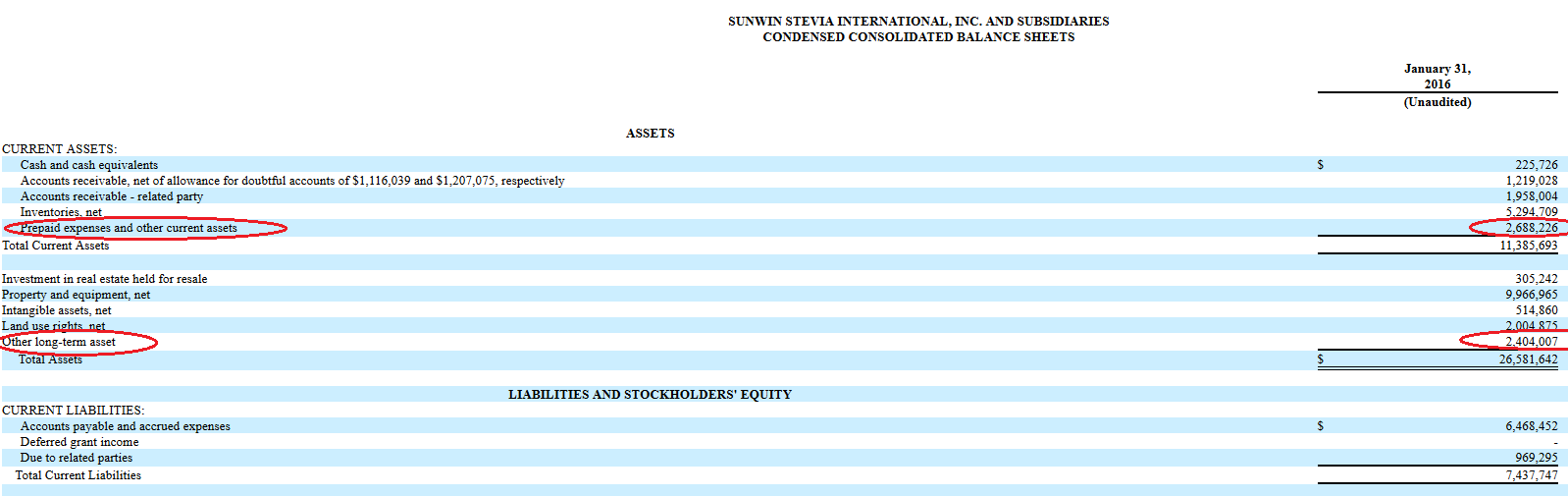 "Prepaid expenses and other current assets on January 31, 2016 and April 30, 2015 totaled $2,688,226 and $467,054, respectively. As of January 31, 2016,