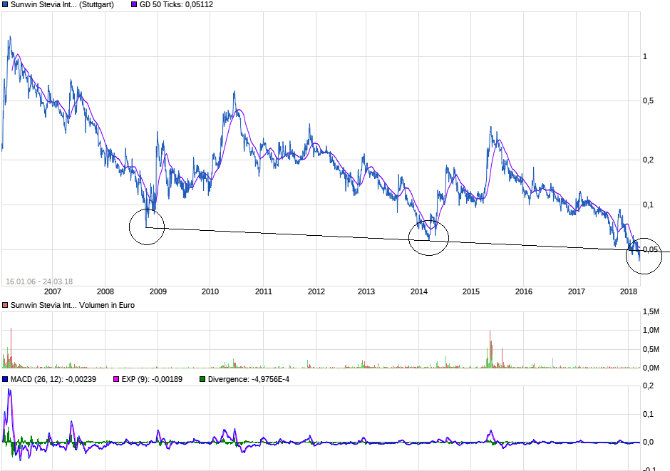 Charttechnische Unterstützungen sind nunmehr nur noch im Rahmen technischet Gegenreaktionen zu erwarten, weil nach unten "alles offen" ist. Dabei ist entscheidend, auf welche Weise entsprechende Kurse erreicht werden. Ginge es z.B. schnell unter die 0,04, wäre schon bei 0,035 eine Gegenreaktion zu erwarten...unterschreiten von "geraden Marken", wie es die 0,03 wäre, ist stets kritisch zu sehen. Darum würde ich dazu raten, Einstiegspunkte niemals bei Unterschreiten solcher technischer Marken zu setzen, sondern bei Bestätigungen darüber. Is aber nur meine Meinung. ;-)