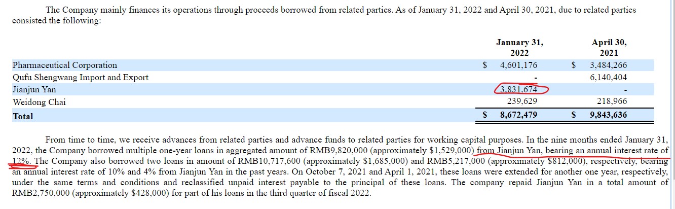 Aber die Peinlichkeiten gehen natürlich noch viel, viel weiter! "Wir" klagen nicht nur über den globalen Preiszerfall unserer "gesunden Minze", welche uns Konkurrenz bis zum Abwinken beschert hat und damit Überproduktionen auf Jahre hinweg voraussehbar sind (siehe letztes 10-Q, Seite 20, Zitat: "Meanwhile, we are also facing challenges in competitive pricing and raw materials for the fiscal years ended April 30, 2022 and 2021, as well as negative impact from the global COVID-19 pandemic. During the fiscal years ended April 30, 2022, the market prices of stevioside products continue to be impacted by strong price competition among Chinese manufacturers. With this being a product gaining large market shares in China, in the recent years we have seen many competitors entering the market. These new competitors use lower pricing as their effort to gain market share as they initially entering the market, thus driving down the average prices for stevia products. We expect the pressure from pricing competition to continue in fiscal 2023")