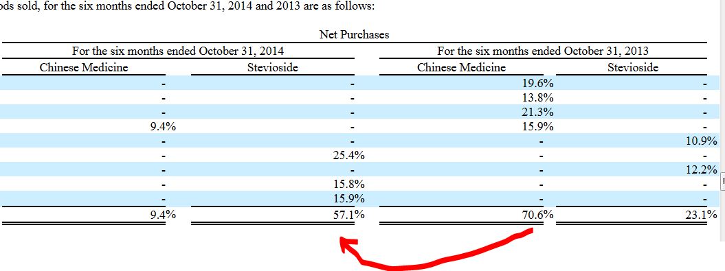 The top vendor concentrations, which the purchase from those vendor is over 10% of total cost of goods sold, for the six months ended October 31, 2014 and 2013 are as follows: