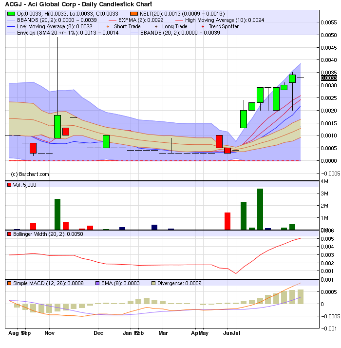 Das warten auf den möglichen 10.000% run. Die Zahl basiert auf den float von von nur 4 milionen Aktien in Kombination mit dem unwars heimlich günstigen Kurs von nur 0033x0034. Kommt hier eine Übernahme zu Stande wird die Aktie extrem explodieren. Wars heimlich schon 1-2 Tage vorher durch Insider. Ein 4000 Euro kauf zu 0022 vor einigen Tagen lässt mich positiv gestimmt sein. Wer kauft für 4000 Euro ohne nennenswerten Grund? Die konstante aufwarts Bewegung ein weiteres Indiz. Zudem hat sie firma 2010 ihren namen geändert. Das sind oftmals vorzeichen für eine mögliche mantel übernahme. Das ganze dauert immer einige Zeit. Sie derzeitige bewegung könnte das erste zeichen sein.