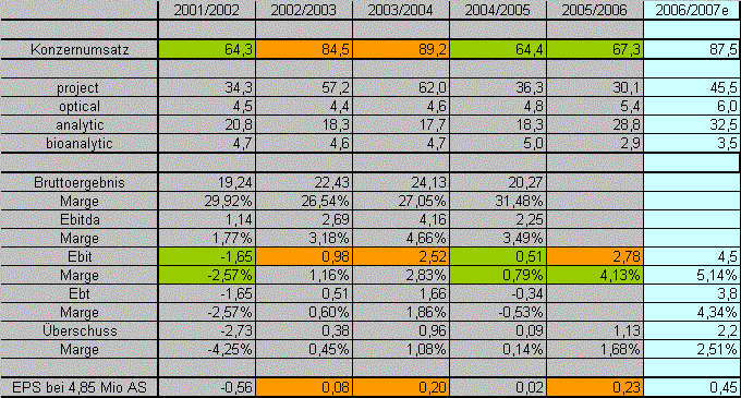 Bedingt durch den hohen Anteil des Instrumentengeschäfts am Konzernumsatz stieg die Bruttomarge von 31,5 Prozent im Vorjahr auf 37,0 Prozent im Berichtszeitraum. Das Ergebnis vor Abschreibungen, Finanzergebnis und Steuern (Ebitda) stieg um 112,6 Prozent auf 4,78 Millionen Euro, das Betriebsergebnis (Ebit) um rund das Fünffache von 511.000 auf 2,78 Millionen Euro. Der Konzern erwirtschaftete dabei einen Jahresüberschuß in Höhe von 1,13 Millionen Euro, nachdem dieser im Vorjahr nur magere 85.000 Euro betragen hatte und damit - abgesehen vom Verlustjahr 2001/2002 - so niedrig ausgefallen war wie in den vergangen sechs Geschäftsjahren nicht.