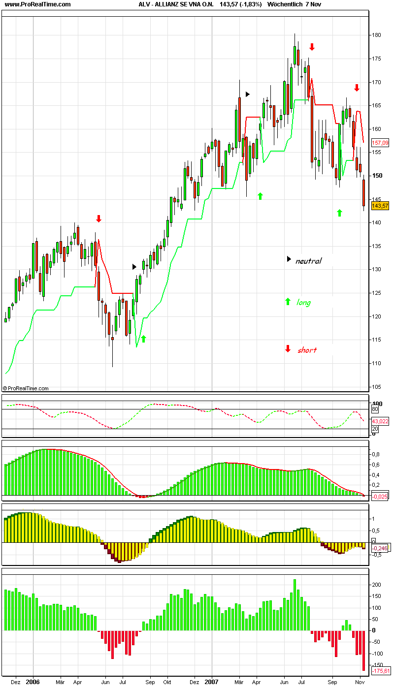 Nun zur Allianz selber, jetzt muss sich erst einmal herausstellen wieviel Leichen die im Keller haben und das kann dauern, schließlich können die Quartalsberichte leicht geschönt werden (Verluste werden nach hinten verschoben), denn der NETTE Ceo Herr Diekmann möchte uns bestimmt nicht einweihen, in wie weit er in der Subprime-Schei... involviert ist, deshalb ist es nicht ausgeschlossen, dass wir Kurse sehen unter dem was jetzt am Markt üblich ist. Abwarten!!!